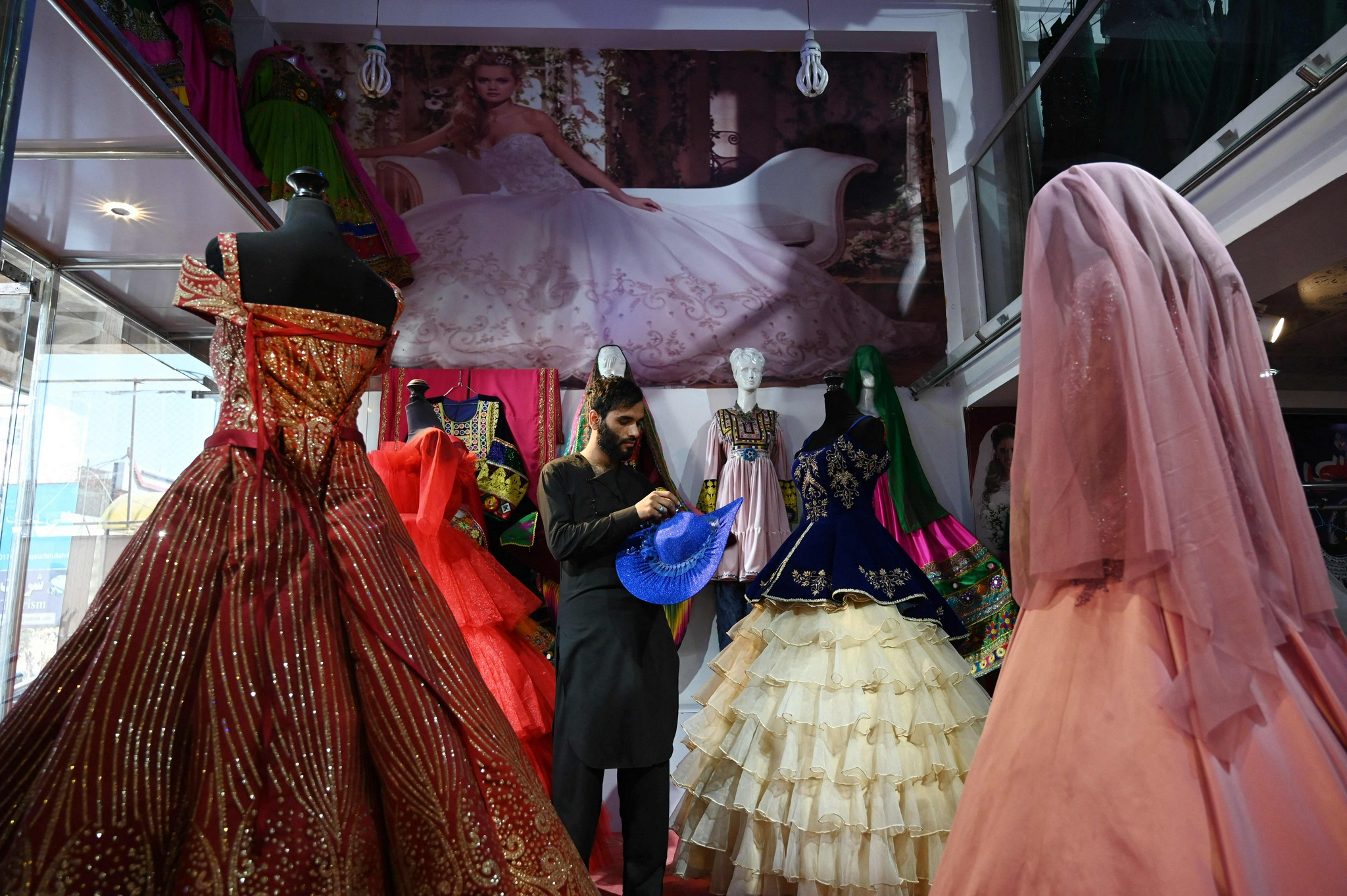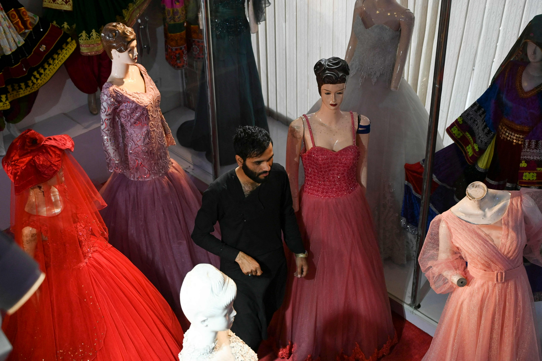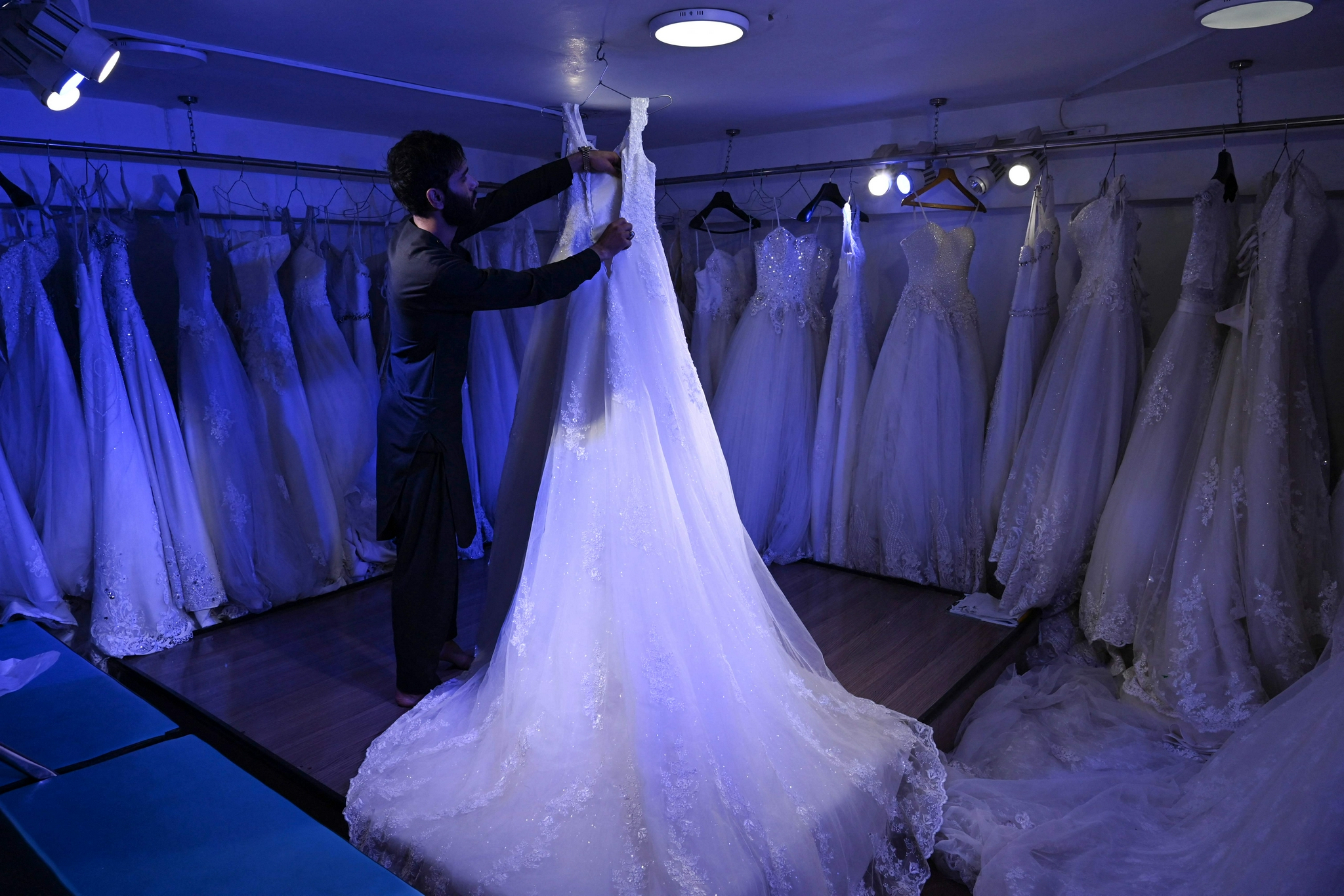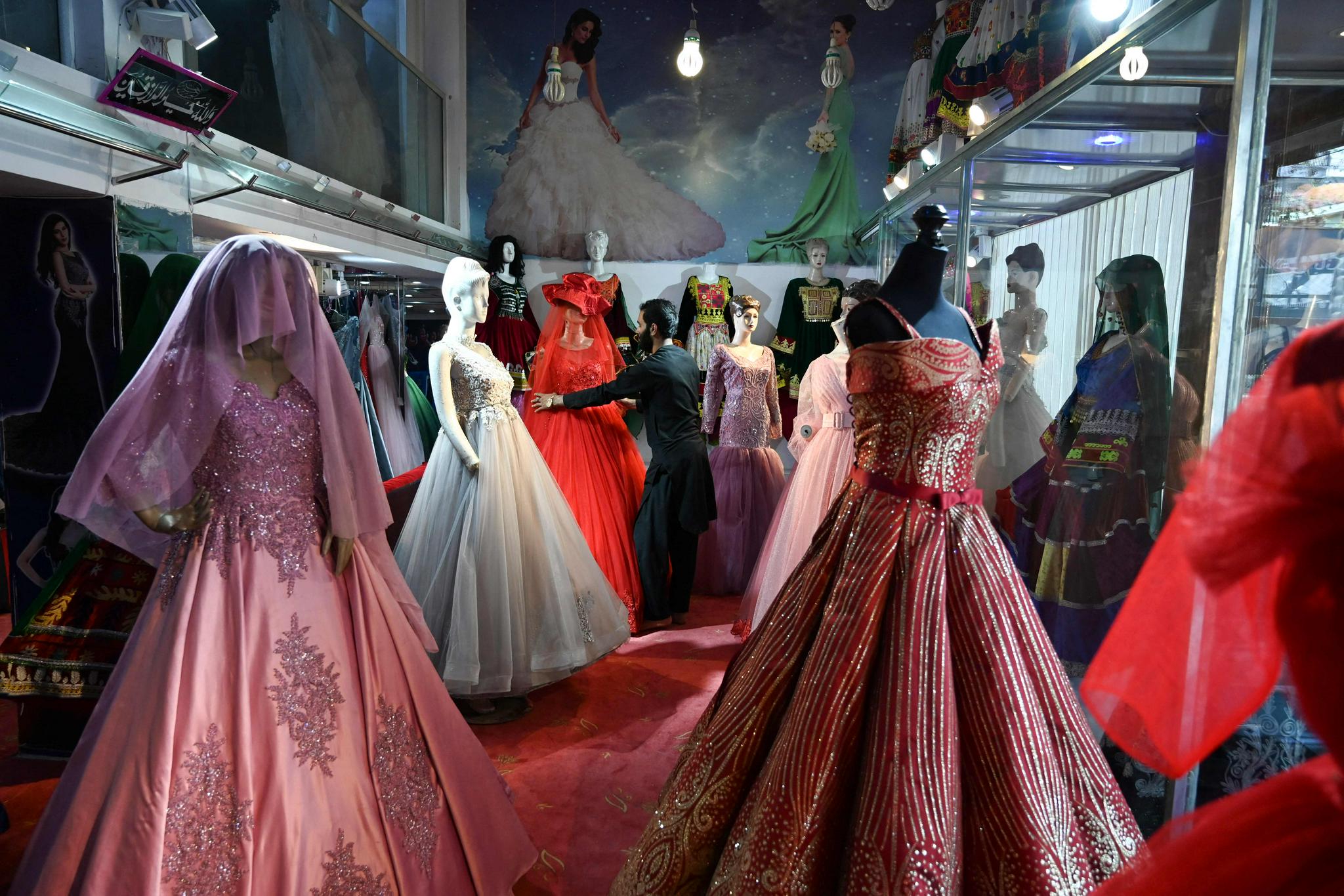 9月2日,顾客在阿富汗首都喀布尔一个婚纱店选购婚纱。新华社/法新