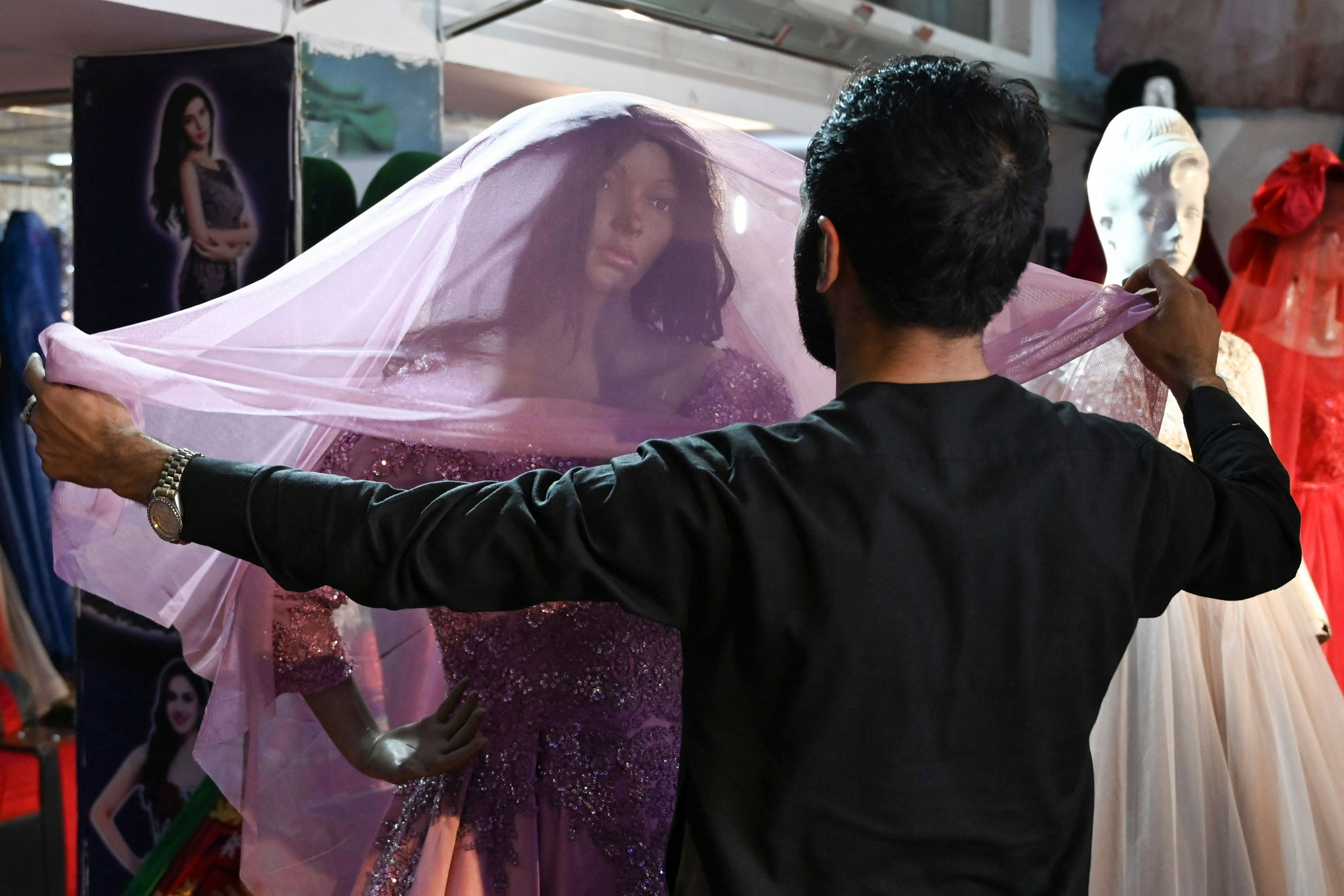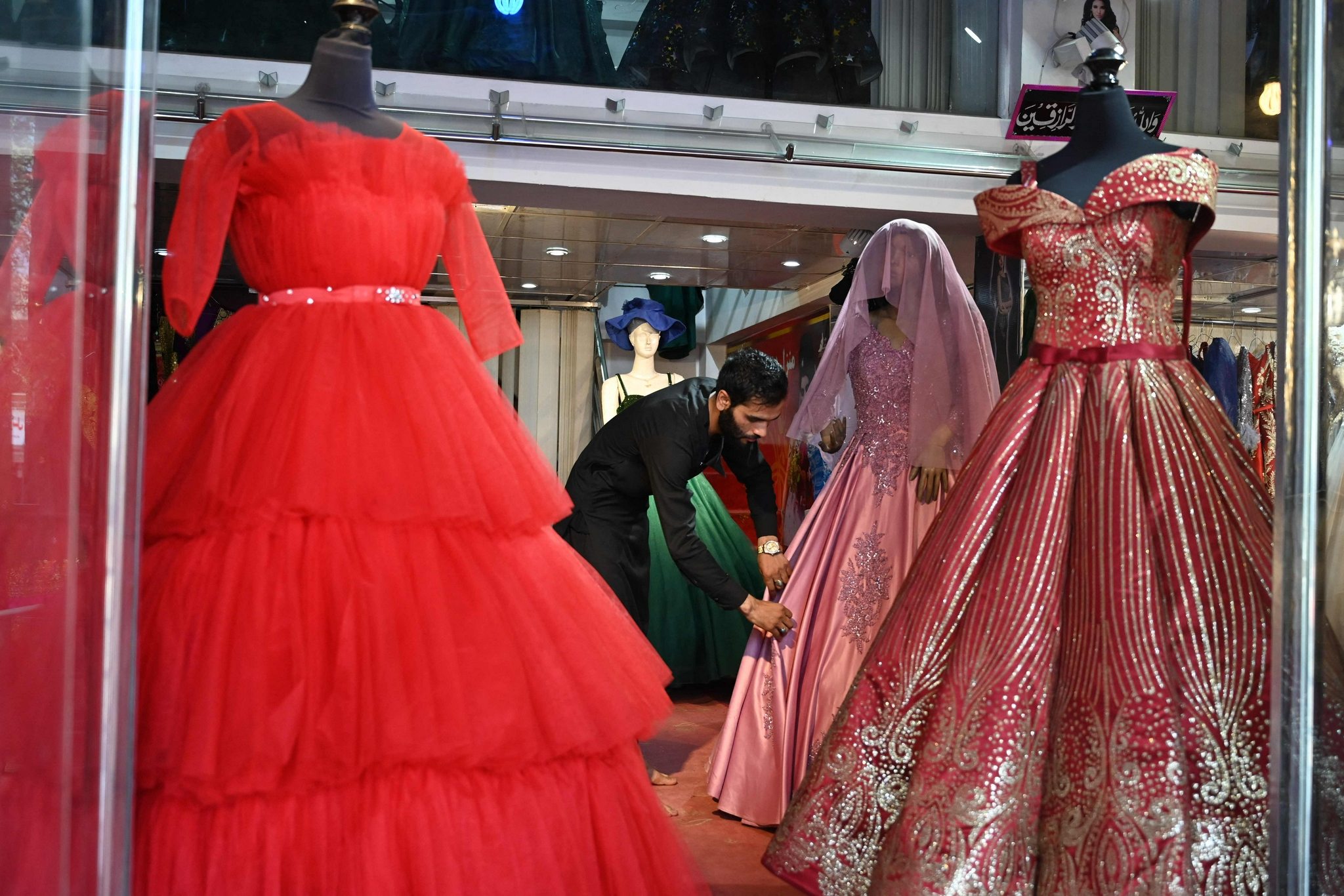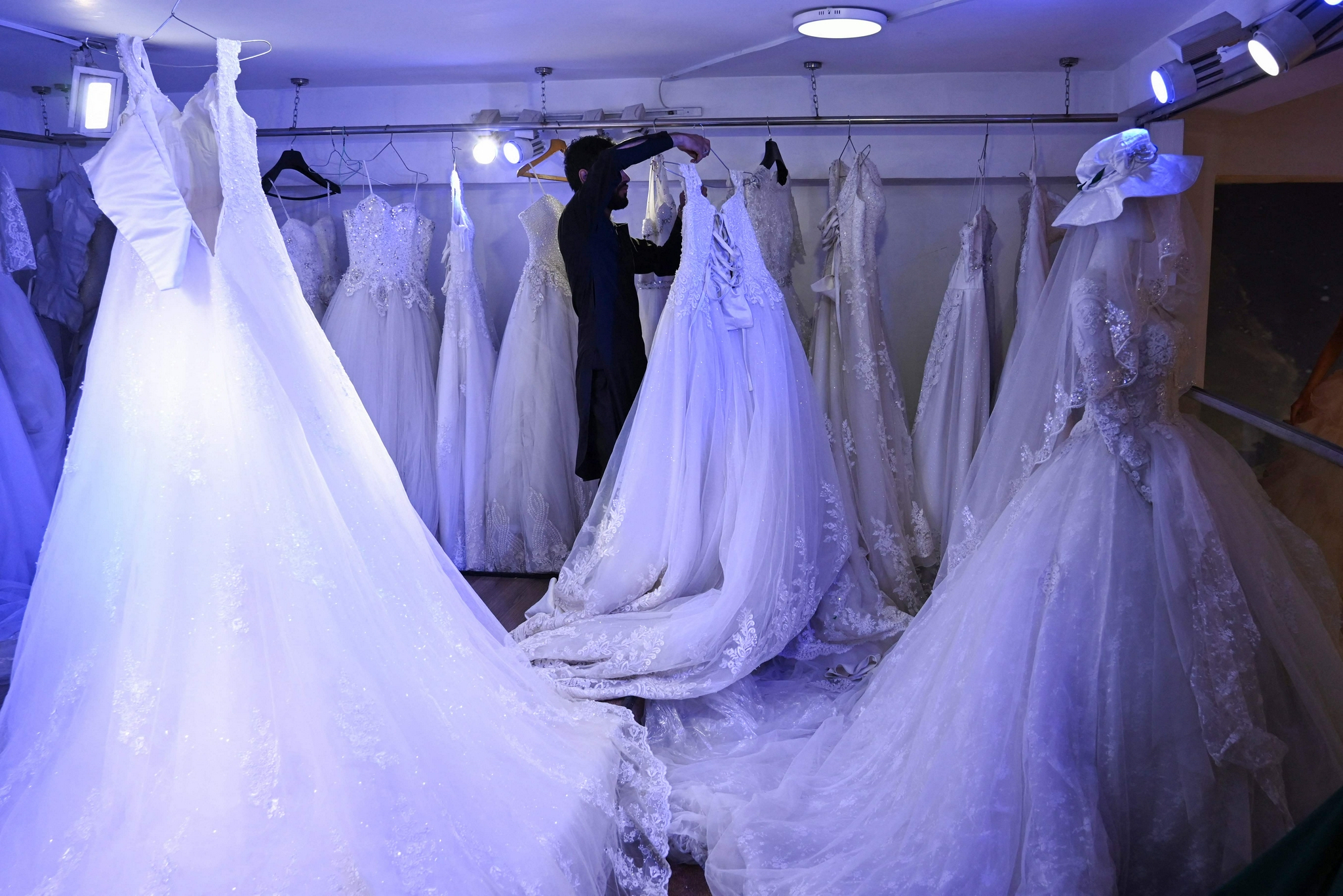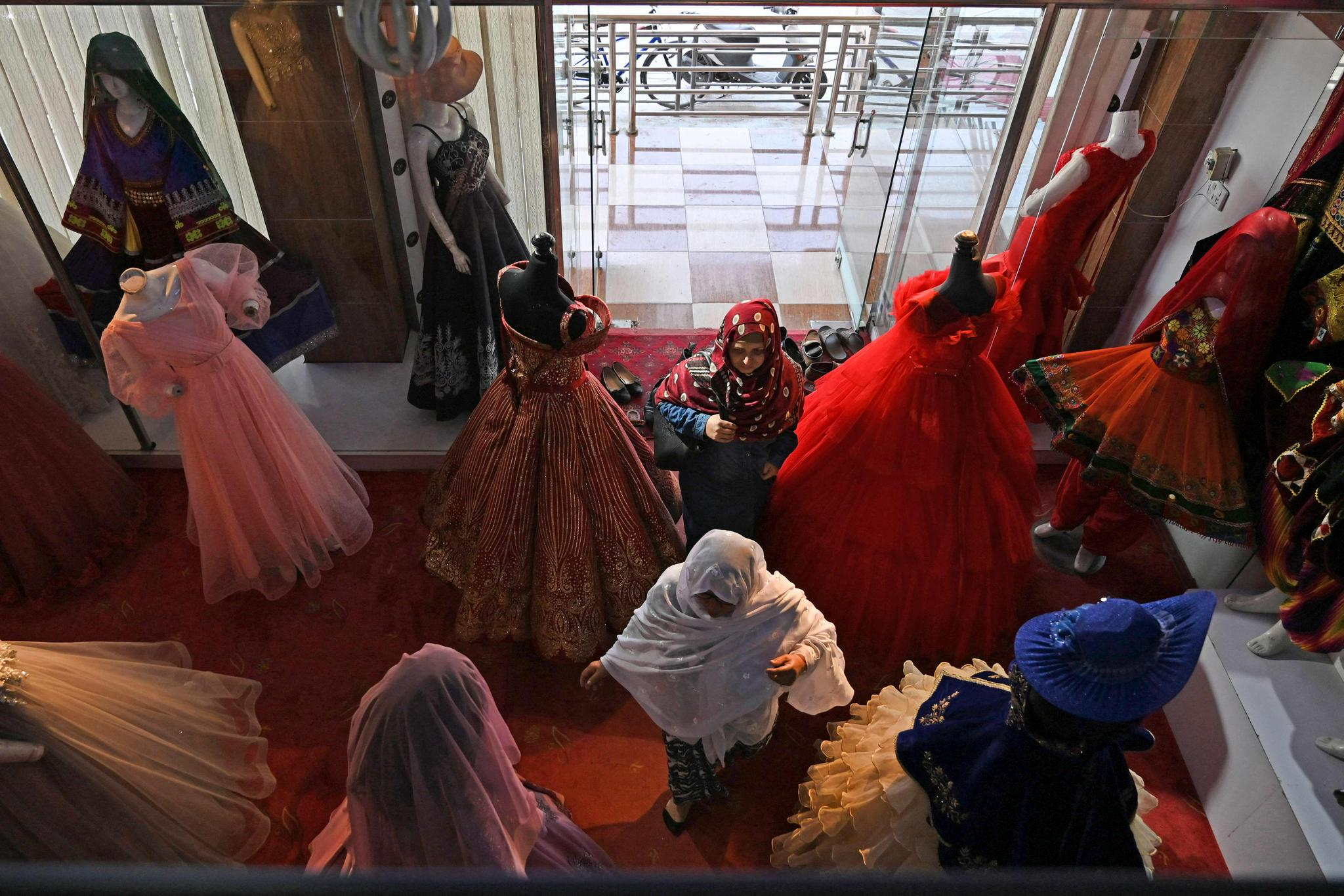 9月2日,顾客在阿富汗首都喀布尔一个婚纱店选购婚纱。新华社/法新