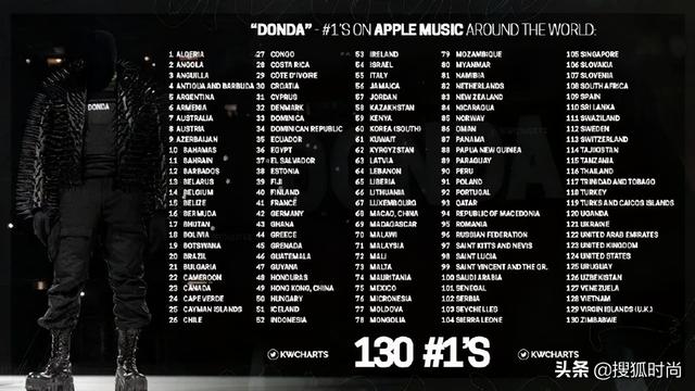 专辑发布后,在短短一天的时间内,《Donda》就在全球130个国家和地区的Apple Music登顶,创造了专辑登顶最多国家和地区的记录,不得不说侃爷还是侃爷。