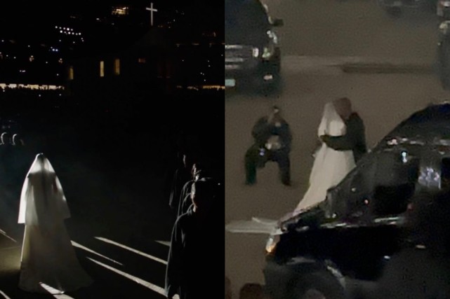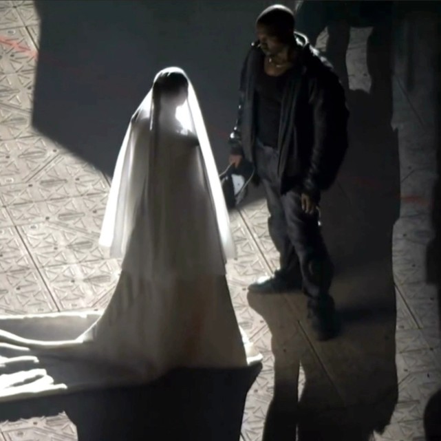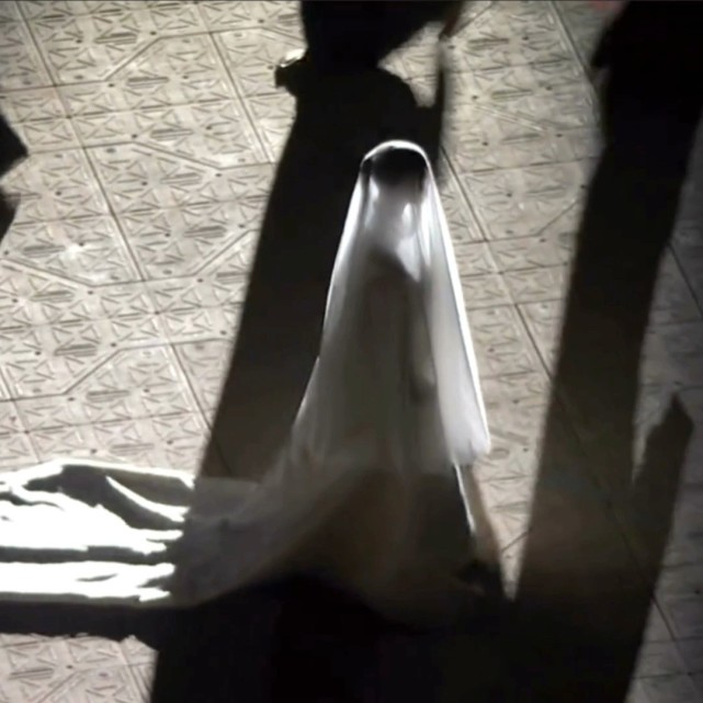 在长马尾的外面,几乎要到膝盖处的头纱为金姐的面容蒙上了一层迷雾,更别提她还是背对着镜头的,俨然看不出来金姐脸上的表情神态。金姐与身穿一身黑的坎爷面对面站着,分分钟让人重回这对前夫妻的恩爱时刻。