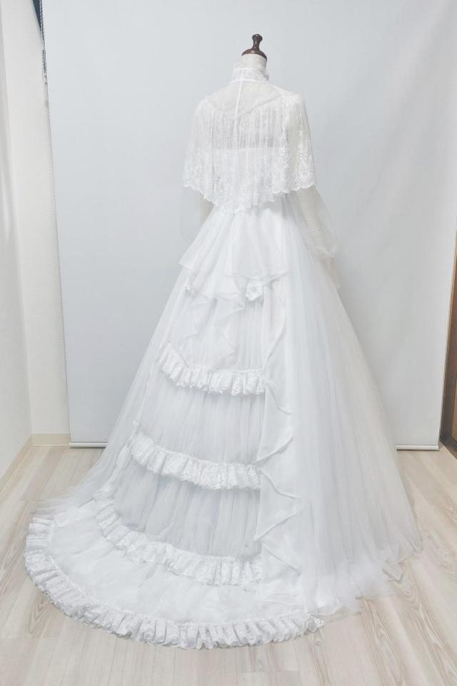 在采访中,“ねぎ”女士谈到:“2年前,朋友办婚礼时按照新娘的要求做过婚纱。当时婚纱主流是露肩款,但是我想穿传统款式的,就想自己缝了。后来和朋友商量构思的样式并请他画了设计图,除此之外,从纸样到裁缝都是自己动手完成的。设计在两年前就完成了,不过中间有婚礼延期和取消的影响,从开始制作算一共花了半年。因为婚礼上背身的时候比较多,就用了很多花边和布重点设计了身后部分。”