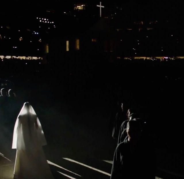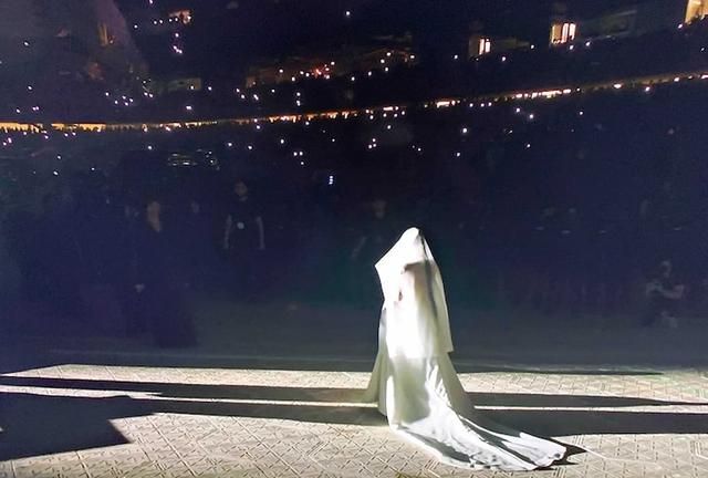 这次金·卡戴珊亮相的造型将前卫与复古融合在一起,经典的拖尾设计和暗黑系场景十分搭调。扎着长马尾的Kim,给人端庄而神圣的气场,简约气质款的白色婚纱,搭配朦胧梦幻的头纱,让人看不清她的面庞,营造出一股若隐若现的感觉。
