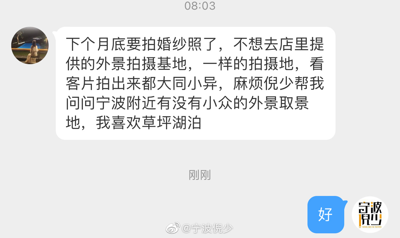 @紫藤云烟zqq 投稿:下个月底要拍婚纱照了,不想去店里提供的外景拍摄基地,一样的拍摄地,看客片拍出来都大同小异,麻烦倪少帮我问问宁波附近有没有小众的外景取景地,我喜欢草坪湖泊