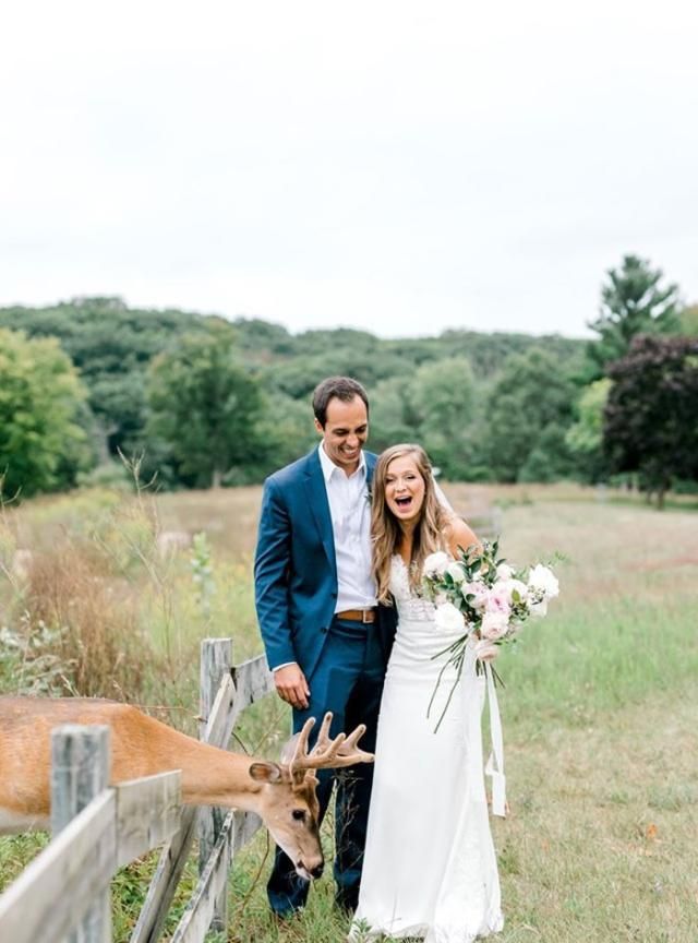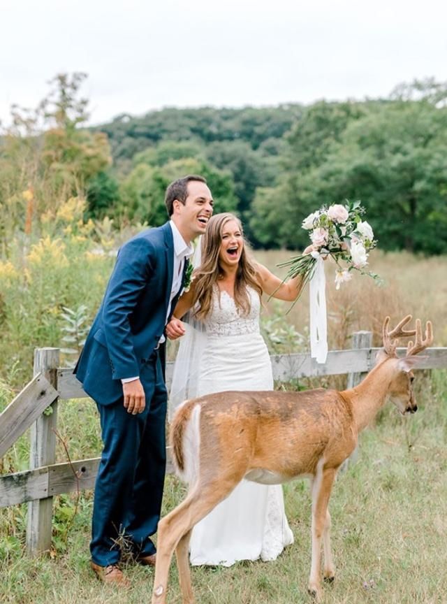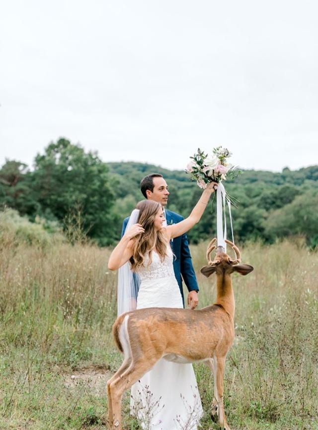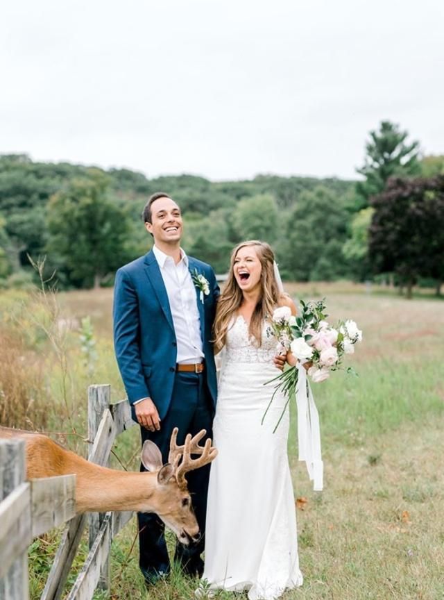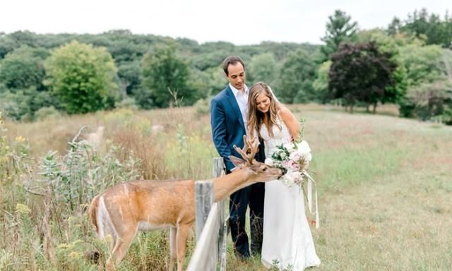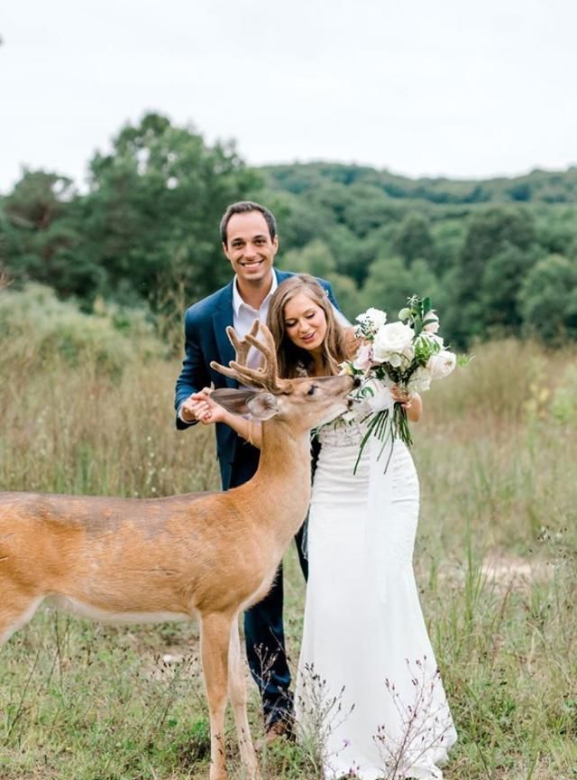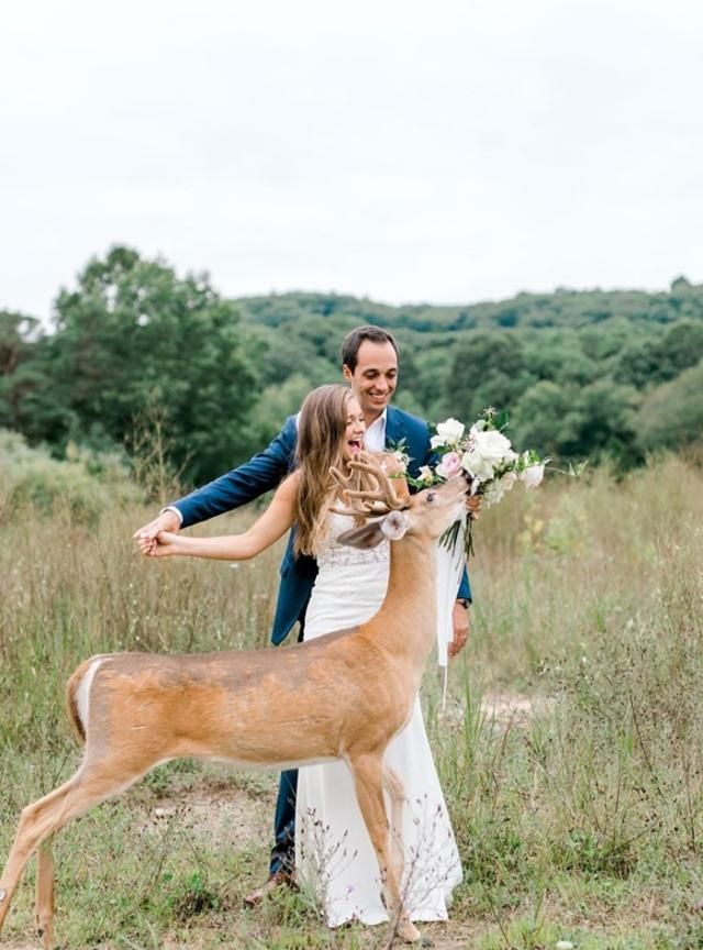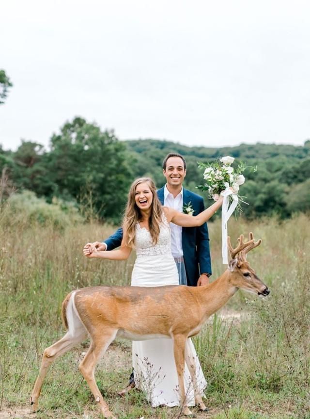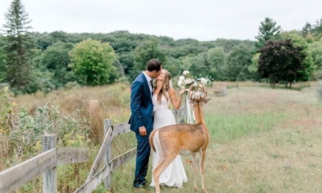 当天卢克和梅根就在不远处举行他们的婚礼,现场有音乐,美食,鲜花与朋友们。这时候卢克提出建议说趁天气好的时候,去这块草地拍一张合照来记录今天的美好瞬间。梅根二话不说就同意了,他们踏着轻易的步伐来到了这块与小鹿相遇的草地。