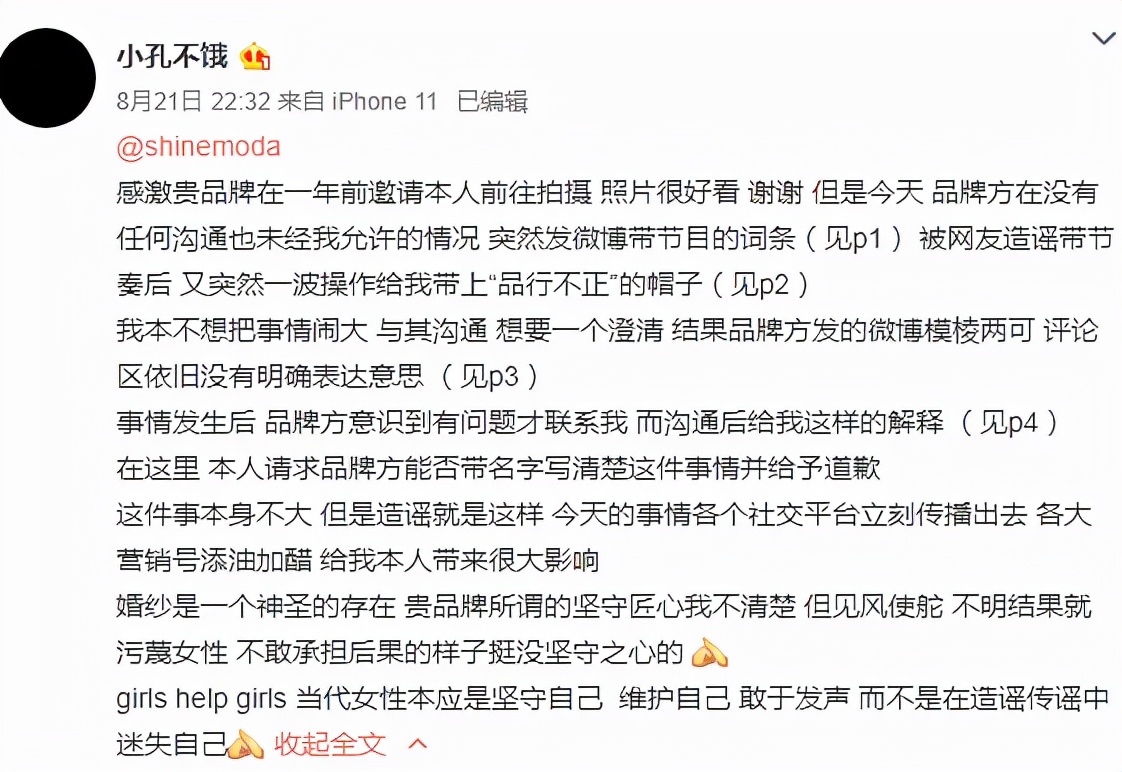 婚纱店给女四扣了品行不端的帽子,后来误会解释清楚,品牌方再次发文道歉,这次他们的道歉很“委婉”,说他们是用词歧义,导致了观众的误解,甚至没有点名道姓。