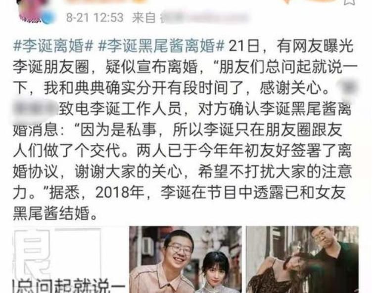 8月21日,李诞在社交平台承认了自己跟黑尾酱已经离婚了,而且分开也有一段时间了,看来之前一起同框的时候,应该已经不是在婚姻状态之内了。