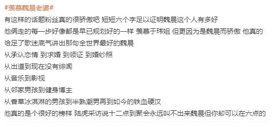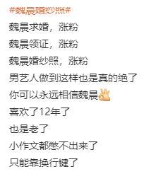 魏晨的粉丝们想必也会因为有一个优质偶像而感到骄傲,国名度很高这么多年也没什么绯闻,承认恋情、求婚、结婚什么的也很爽快。业务能力强,对待感情专一认真,浪漫仪式感满满,不管是事业还是感情都很专注。