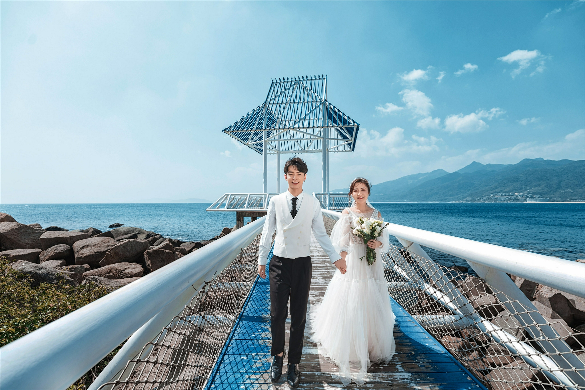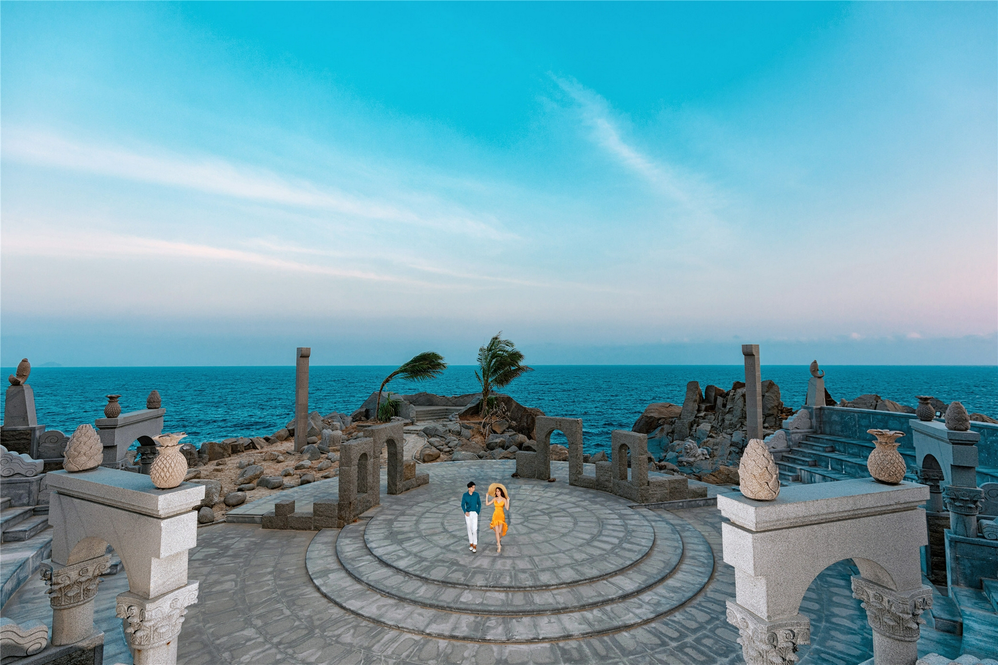 大小洞天风景区是国家五A级景区,这里的海景、山景、石景号称琼崖第一山水名胜。在这里可以拍摄的元素有很多,比如礁石、椰林、原木小屋、观海长廊,还有最具特色的海天一线。海天一线其实是大小洞天开发出来的拍摄场景,海平线和天空的蓝色融为一条线,拍摄时就像新人站在海天相接的地方,非常浪漫!