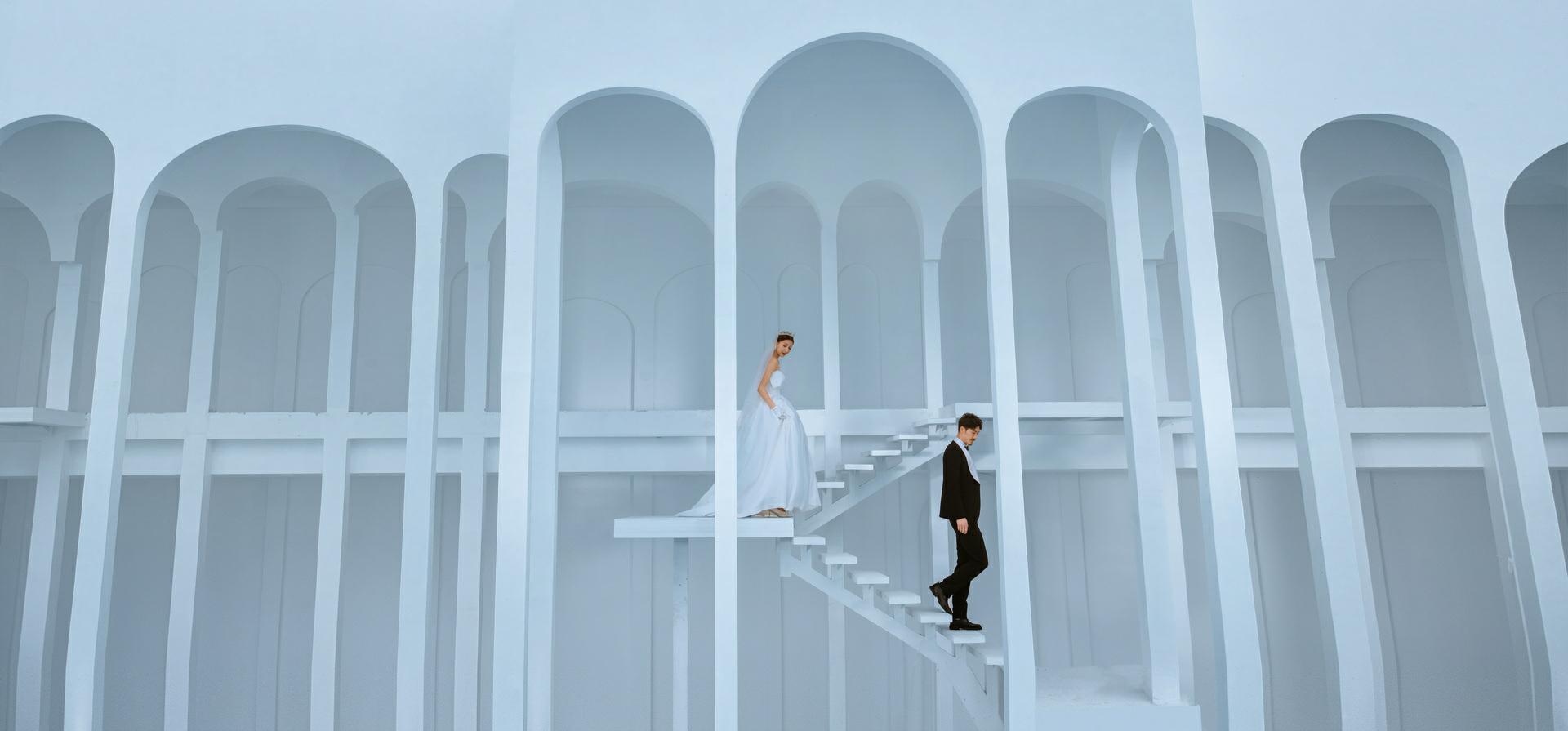 看向彼此,但不要站得太直,会显得比较僵硬,表情自然放松。此时此刻眼里好像就只有彼此,有一种岁月静好的美好。