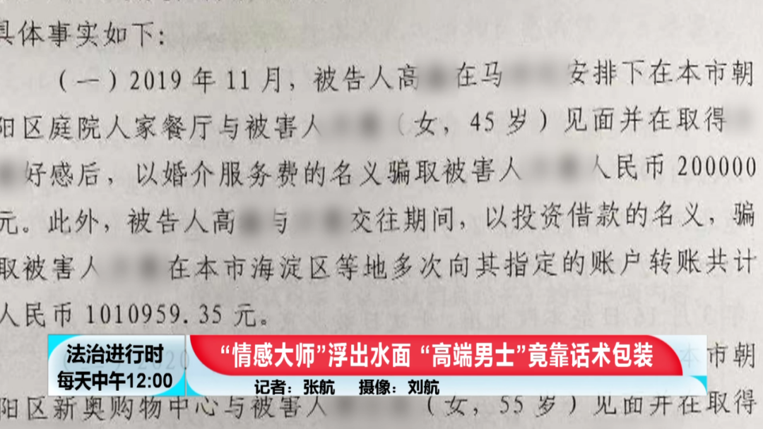 据了解,2019年11月,马某安排高某与小美见面,以婚介服务费的名义骗取了被害人小美人民币20万元,此外,高某在与小美交往期间以投资借款的名义骗取被害人小美人民币100余万元;2020年7月,马某再次安排高某与被害人小雪见面,并以婚介服务费的名义骗取被害人小雪人民币100万元。从高某与马某的聊天记录中看出,截至案发时高某同时交往了七名女性。2021年8月6日,海淀检察院对高某以涉嫌诈骗罪向海淀法院提起公诉,而马某则被批准逮捕做另案处理。