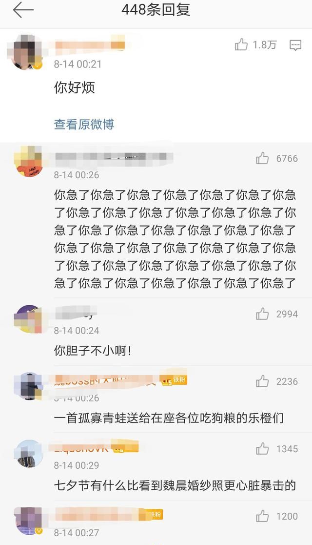 然而魏晨的这一举动伤了不少粉丝的心,这么高调秀恩爱,都不考虑单身狗的心情吗,难怪评论区第一的热评是:你好烦,果然是魏晨的真爱粉了。让人没想到调皮的网友竟然纷纷点赞,把这个三个字刷到评论第一条。