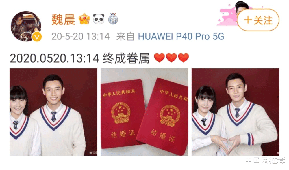 魏晨平时很低调,基本不会晒出跟妻子或私生活相关的信息,但每次发都让人感叹齁甜。去年5月20日13点14分,魏晨晒出结婚证宣布结婚喜讯,配文写道“2020.0520.13:14终成眷属”,很浪漫啊。